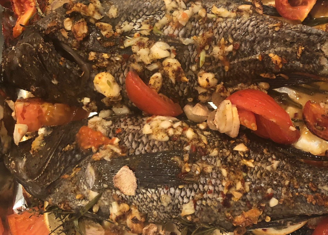 6. Place lemons, tomatoes, herb sprigs inside the cavity of each piece of fish